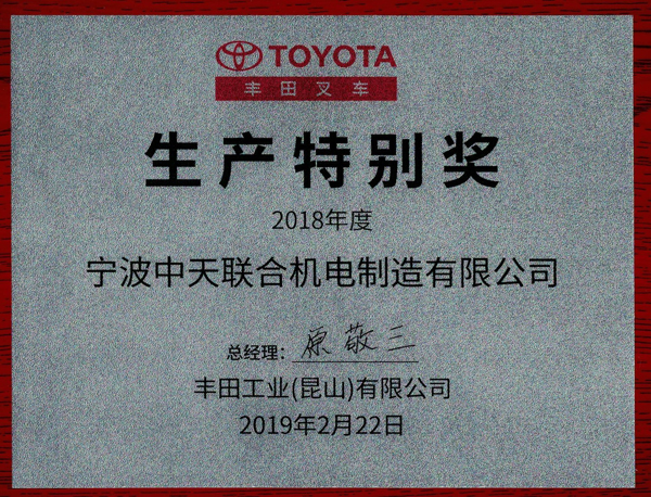 中天聯(lián)合機電喜獲豐田工業(yè)(昆山)有限公司生產(chǎn)特別獎